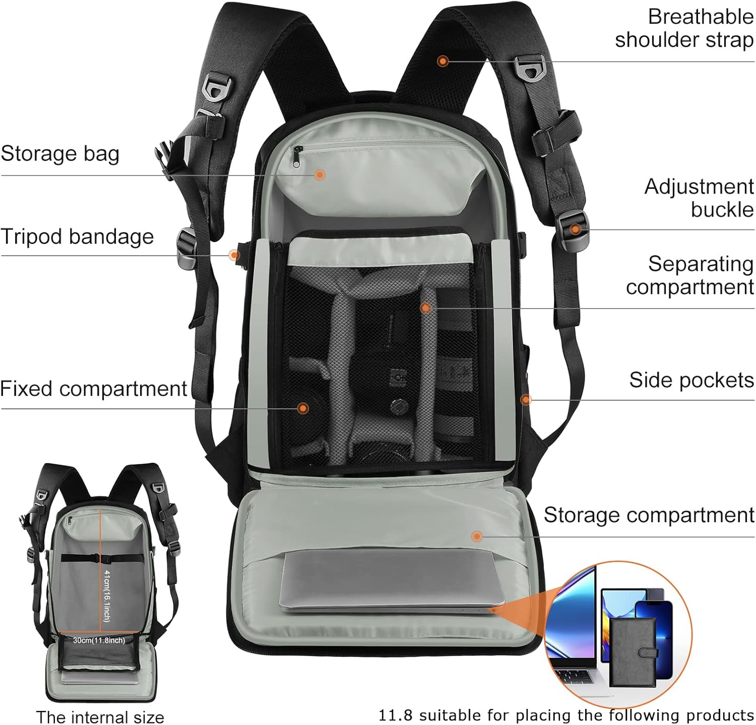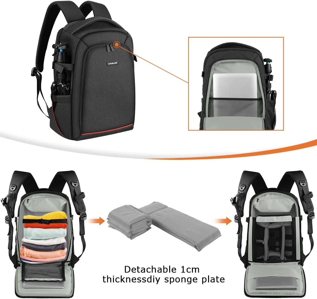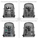 【حقيبة ظهر احترافية للتخزين】 مزودة بقسم إسفنجي قابل للإزالة بسماكة 1 سم، تتميز بمقاومة ممتازة للصدمات، ويمكن تفكيكها واستخدامها بشكل منفصل لحماية معدات التصوير الاحترافية. تتسع جيوب التخزين على جانبي الحقيبة لحوامل الكاميرا، وزجاجات المياه، وغيرها.