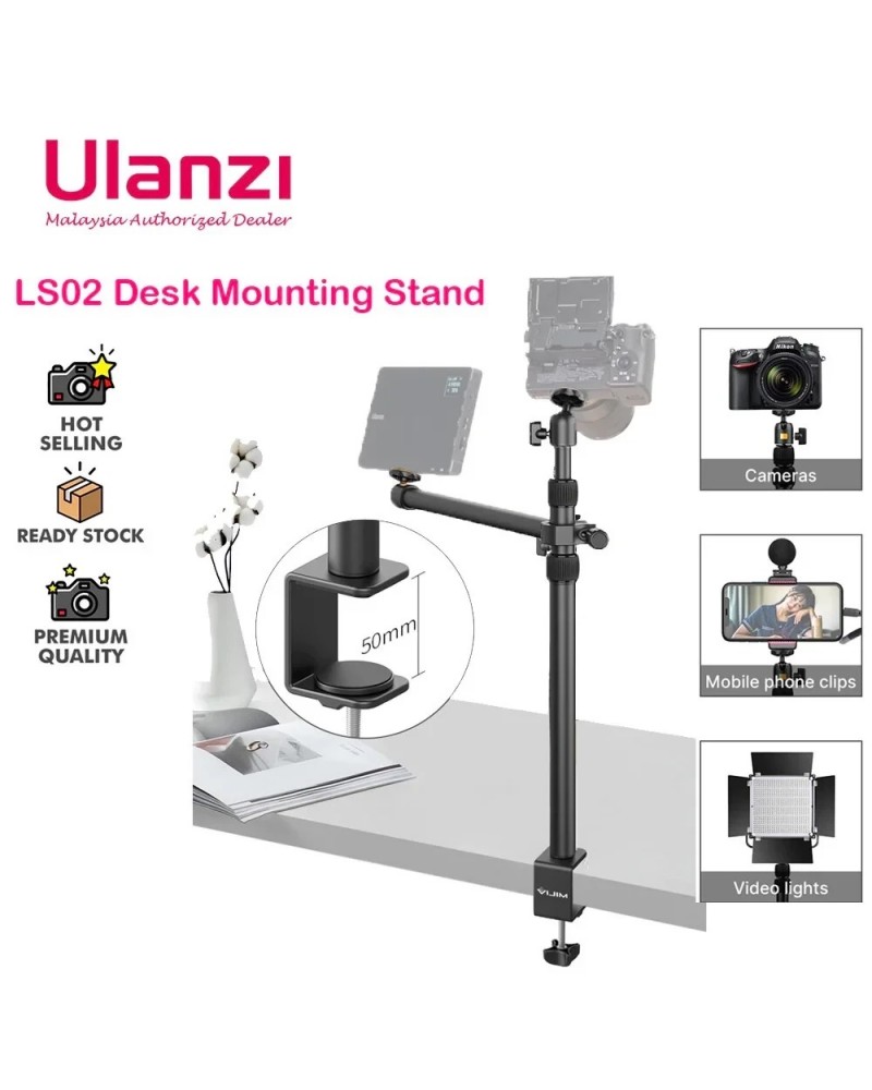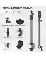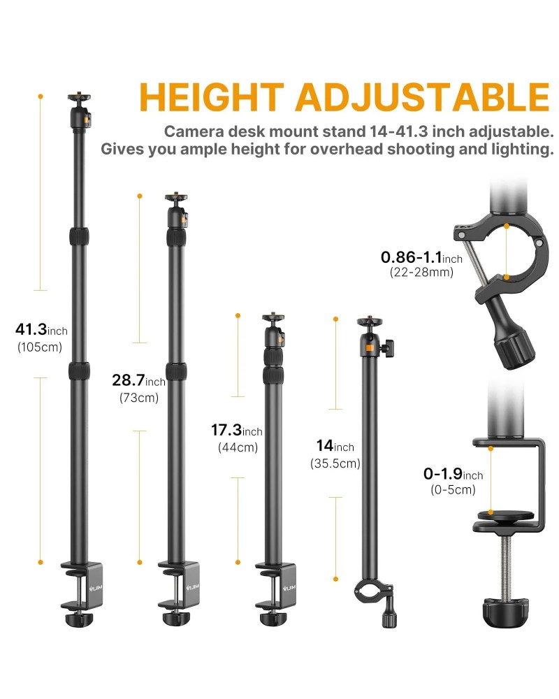 حامل مكتبي قابل للتعديل من 17.3 إلى 41.3 بوصة، يوفر لك ارتفاعًا مناسبًا للتصوير والإضاءة من الأعلى. وذراع تثبيت إضافي بطول 14 بوصة للكاميرات، والإضاءة، والهواتف، وغيرها.
