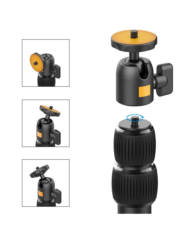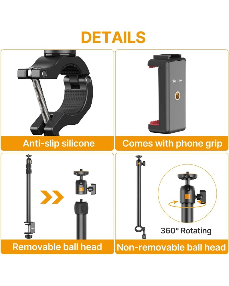 يحتوي حامل التثبيت المكتبي وذراع التثبيت الإضافي على براغي قياسية مقاس 1/4 بوصة، مما يتيح تركيب معظم الكاميرات والإضاءة المزودة بمحول 1/4 بوصة. يأتي الحامل مزودًا بمقبض للهاتف،