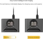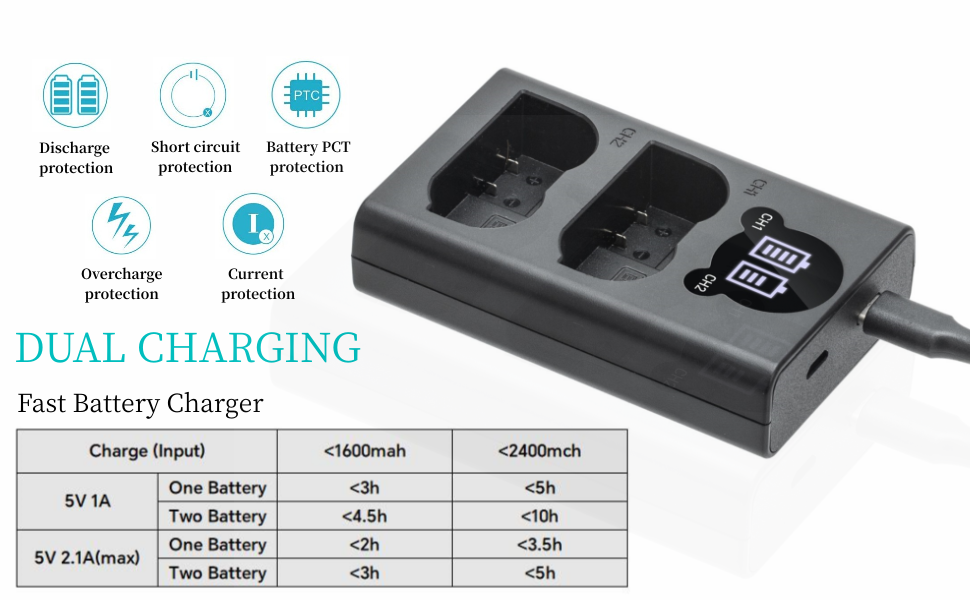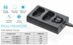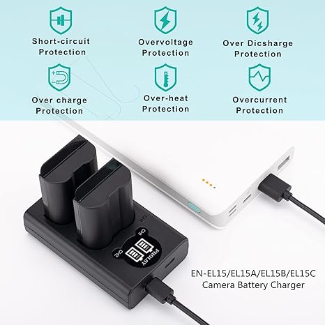 شاشة LCD: الإدخال: 5 فولت/2.1 أمبير، الإخراج: تيار مستمر 8.4 فولت 700 مللي أمبير × 1، 500 مللي أمبير × 2. تصميم بفتحتين يسمح بشحن بطاريتين EN-EL15 أو EN-EL15a أو EN-EL15b أو EN-EL15c في الوقت نفسه. تعرض الشاشة حالة الشحن والطاقة بوضوح، وهو خفيف الوزن ومتين، ويمكن وضعه في أي مكان في حقيبة اليد أو الجيب.
