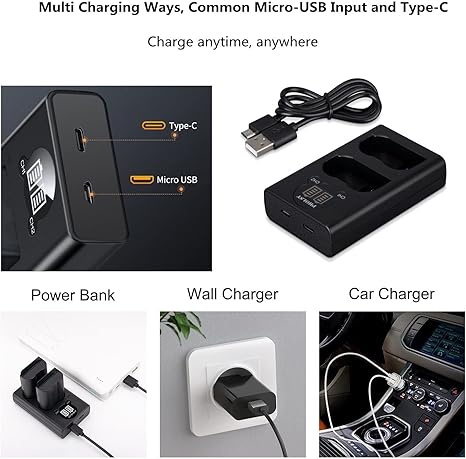 خيارات شحن متعددة: يتميز شاحن EN-EL15 هذا بطريقتين للشحن: ① عبر منفذ Micro-USB؛ ② عبر منفذ USB-C. اشحن باستخدام شاحن حائط USB، أو شاحن هاتف، أو شاحن سيارة، أو كمبيوتر محمول، أو بنك طاقة، مما يمنحك خيارات أكثر من شاحن البطاريات التقليدي.
