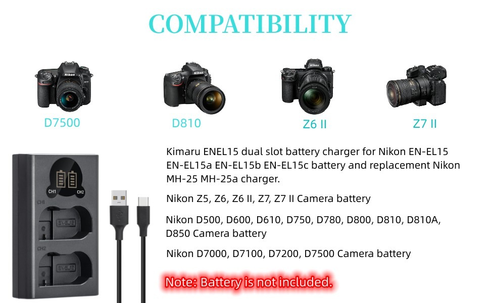شاحن بطاريات ENEL15 ثنائي الفتحات لبطاريات نيكون EN-EL15 وEN-EL15a وEN-EL15b وEN-EL15c، وشاحن بديل لبطاريات نيكون MH-25 وMH-25a.