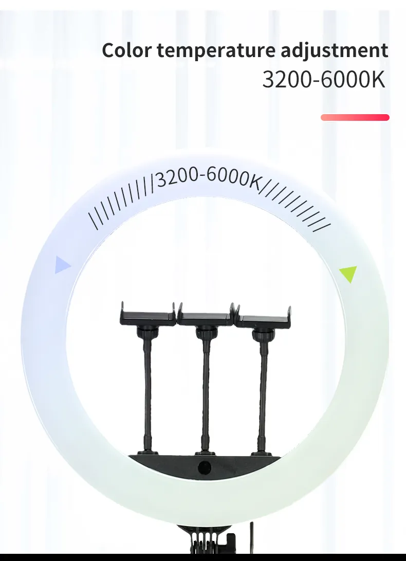 يُعدّ هذا المصباح الحلقي مثاليًا للتصوير الفوتوغرافي، حيث يمكن تعديل زاوية الإضاءة. كما يمكن تعديل سطوعه ودرجة حرارة لونه، ما يجعله مناسبًا لمختلف احتياجات الإضاءة. وهو مناسب للتصوير الفوتوغرافي، وتسجيل الفيديو، والبث المباشر، ووضع المكياج، وغيرها. ويأتي مزودًا بجهاز تحكم عن بُعد لسهولة التعديل.
