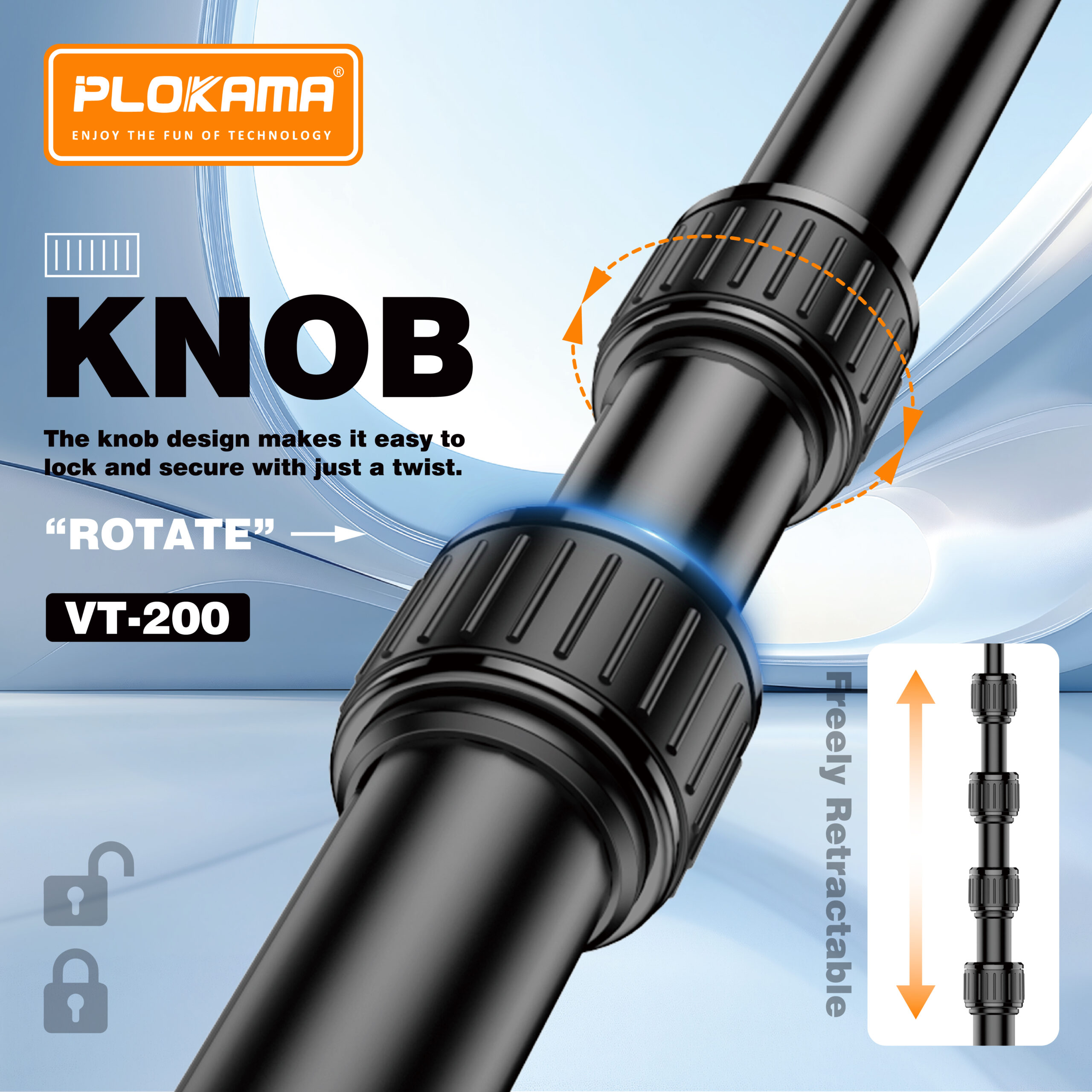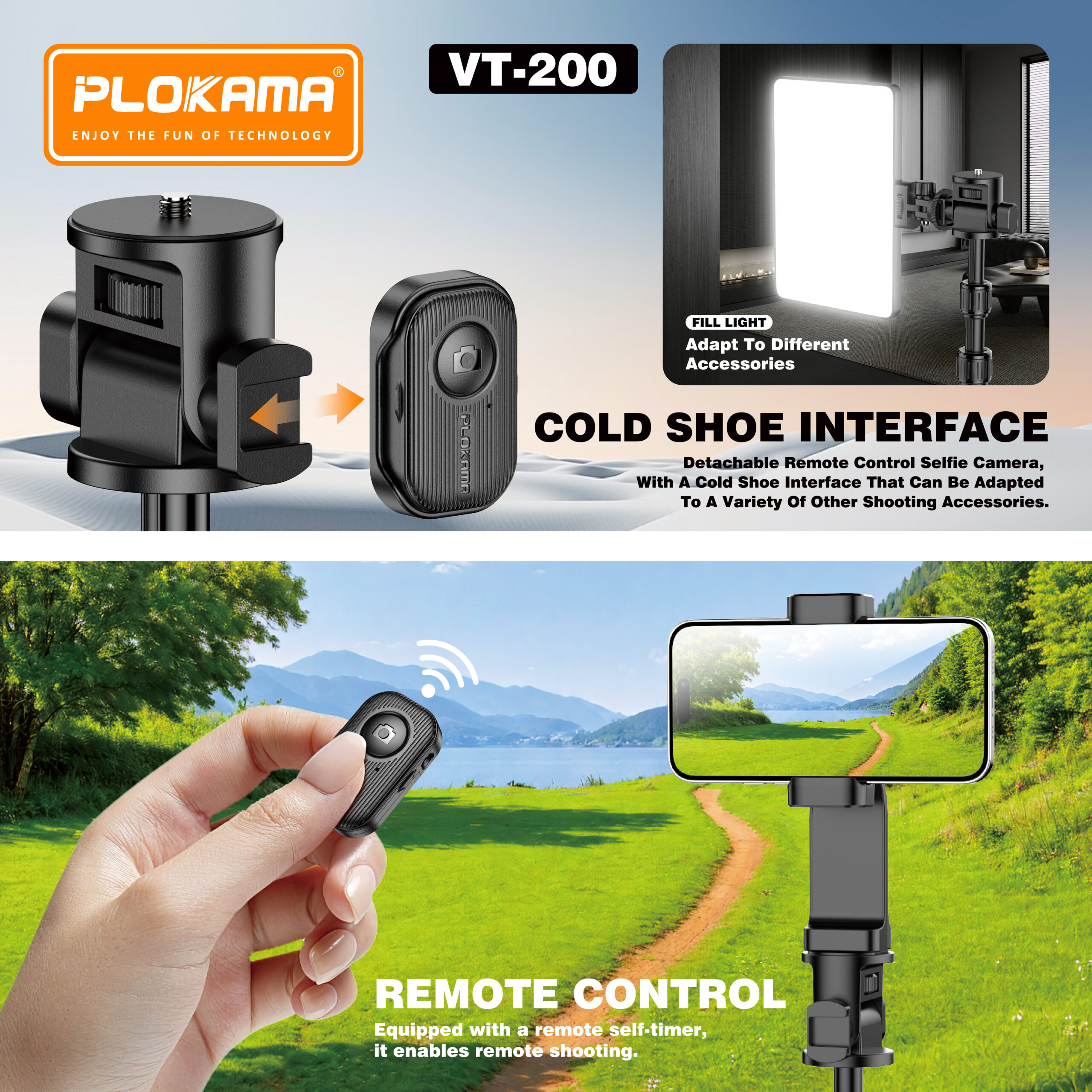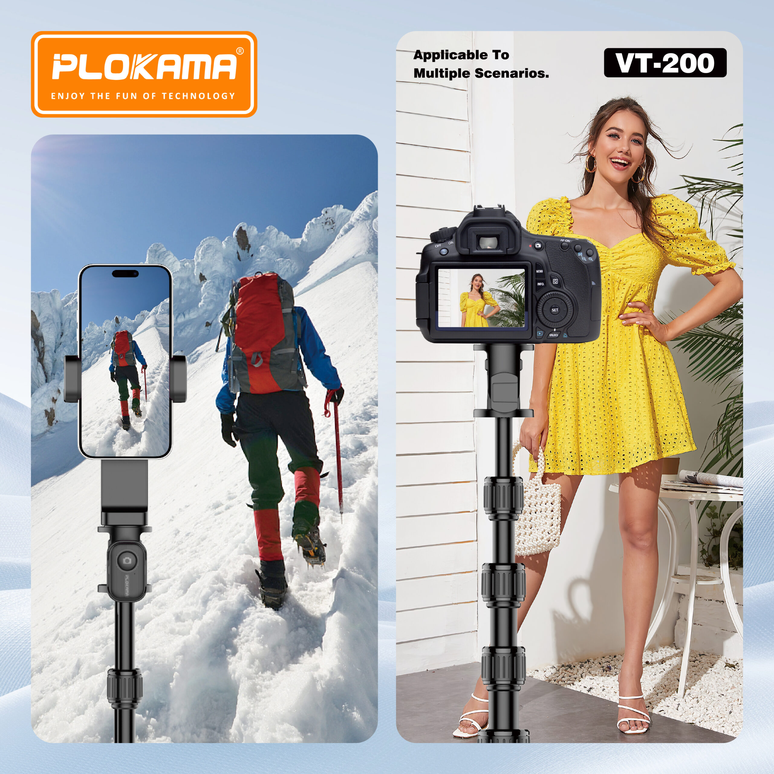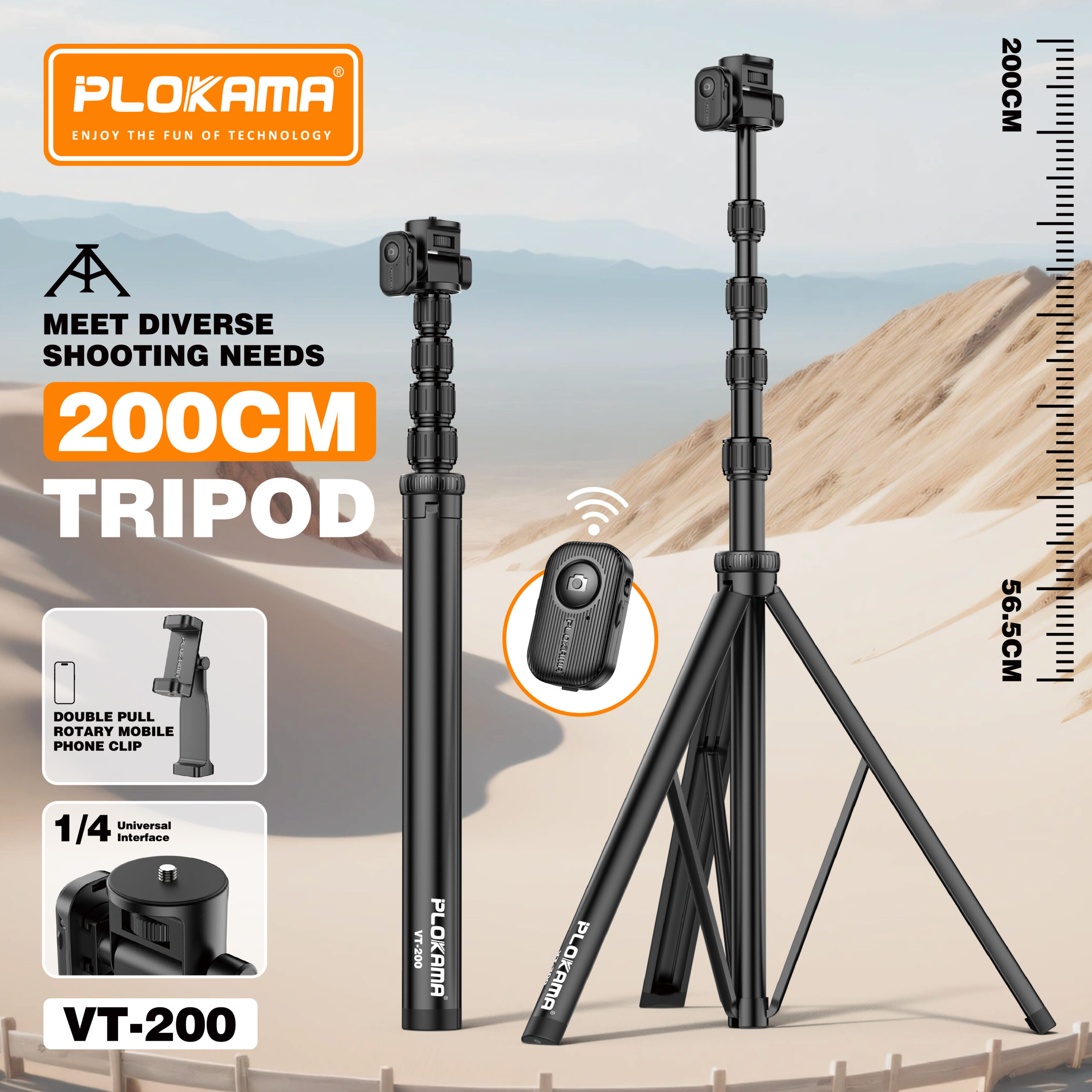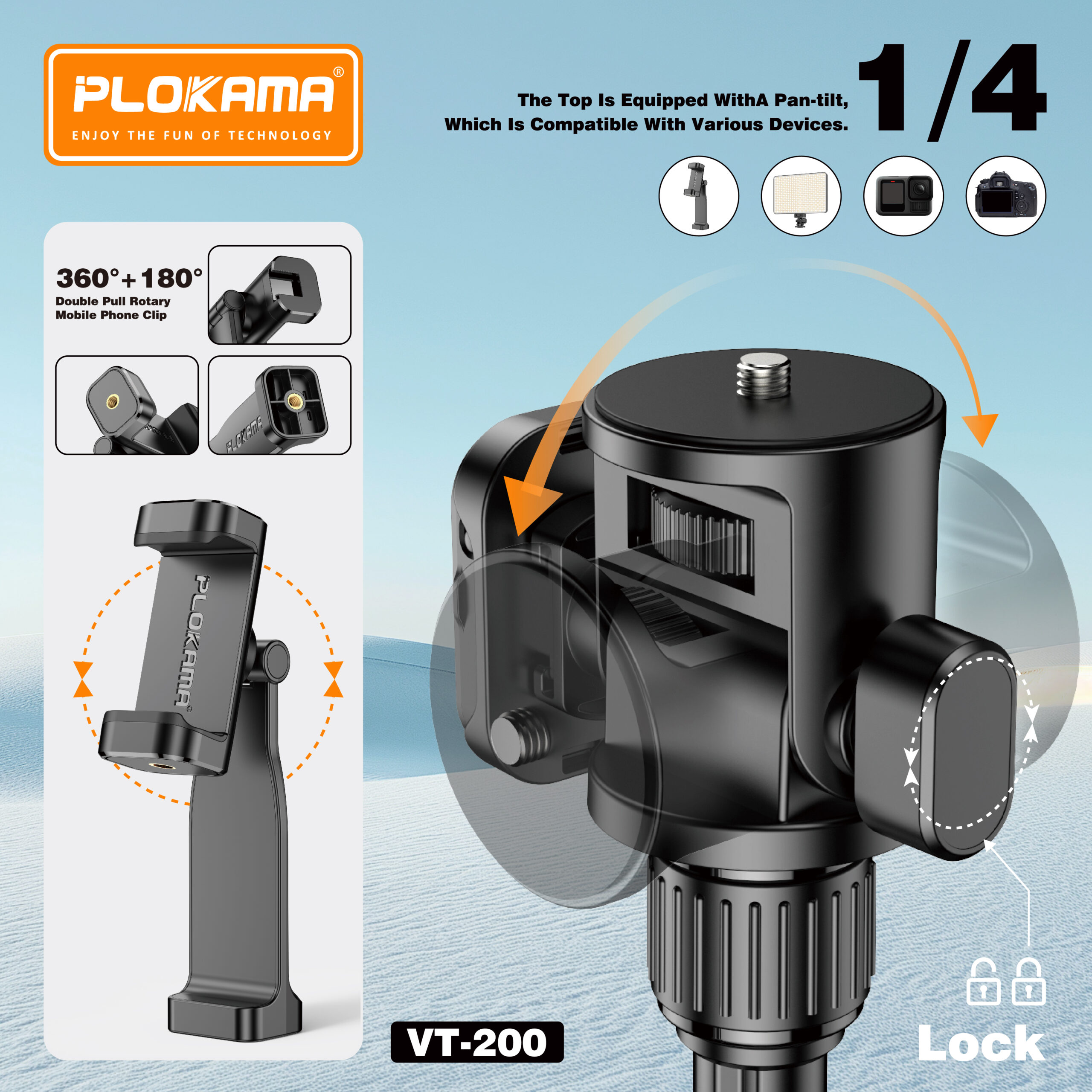 مزود بحامل لولبي عالمي قياس 1/4 بوصة، يدعم هذا الحامل الكاميرات والهواتف الذكية والملحقات بسهولة. يوفر مشبك الهاتف المحمول الدوار ذو السحب المزدوج تثبيتًا محكمًا للتصوير الرأسي والأفقي. على الرغم من ارتفاعه، يتميز حامل VT-200 بخفة وزنه وسهولة حمله وسرعة تركيبه، مما يجعله خيارًا مثاليًا للاستوديوهات الداخلية والتصوير الخارجي.
