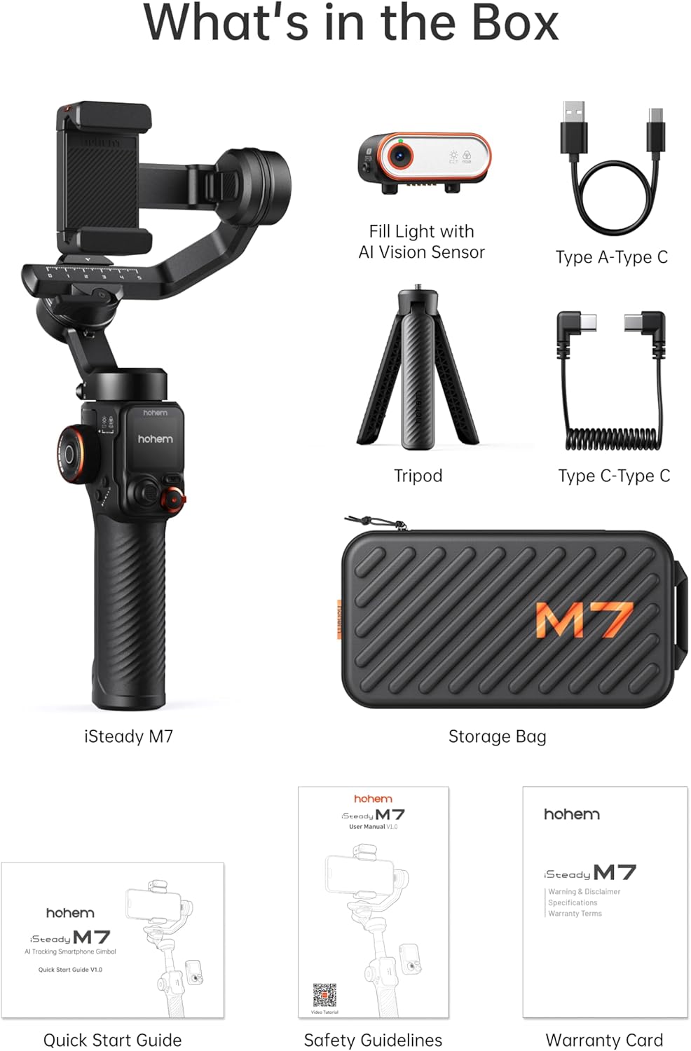 إضاءة تعبئة قابلة للتعديل CCT وRGB: تم تجهيز Hohem iSteady M7 بإضاءة تعبئة CCT وRGB، والتي يمكن ضبطها على ألوان دافئة وباردة ومحايدة، ودرجات حرارة لونية تتراوح بين 2700 كلفن و6500 كلفن. يُضفي ضوء RGB متعدد الألوان بزاوية 360 درجة أجواءً مميزة، ويُحسّن جودة التصوير حتى في الإضاءة الخافتة.