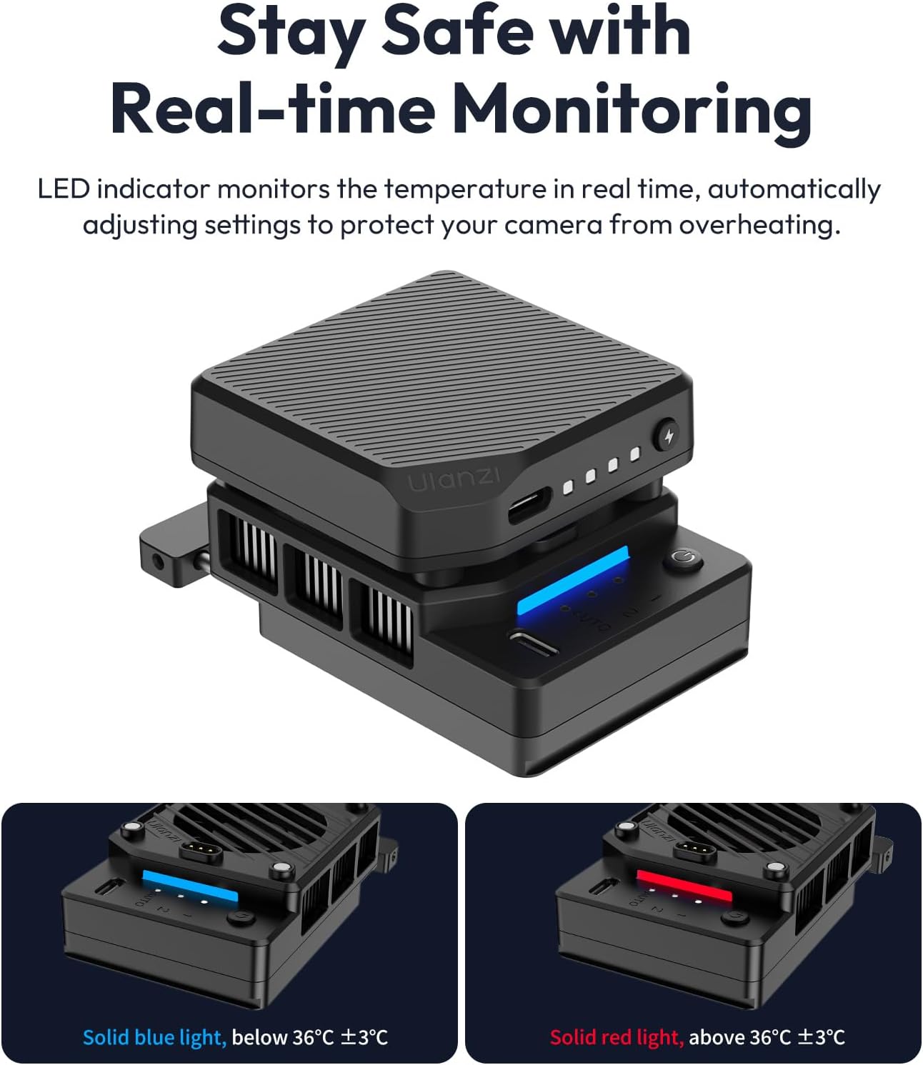 【تقنية تبريد فائقة】 يتميز مبرد الكاميرا ULANZI CU01 بنظام تبريد متطور لأشباه الموصلات، يجمع بين رقائق بلتييه الخزفية وزعانف من سبائك الألومنيوم عالية الكثافة مع مروحة عالية السرعة تصل إلى 6000 دورة في الدقيقة. يوفر هذا الإعداد تبريدًا سريعًا، مما يؤدي إلى خفض درجة حرارة الكاميرا بشكل فعال لمنع ارتفاع درجة الحرارة أثناء الاستخدام المطول، وهو مثالي للتصوير الخارجي الطويل وتسجيل الفيديو والمهام عالية الأداء مثل فيديو 4K أو التصوير الفوتوغرافي بالتعريض الطويل بدون تكثف.