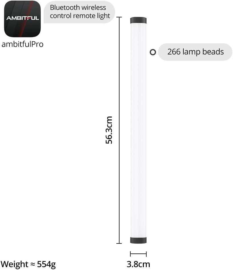 تحكم ذكي في المصباح الأنبوبي RGB: – اضبط الإعدادات عبر الشاشة سهلة الاستخدام أو عن بُعد باستخدام تطبيق ambitfulPro (متوافق مع iOS/Android). يدعم مصباح أنبوب RGB هذا التكامل السلس مع جميع أجهزة سلسلة AMBITFUL.