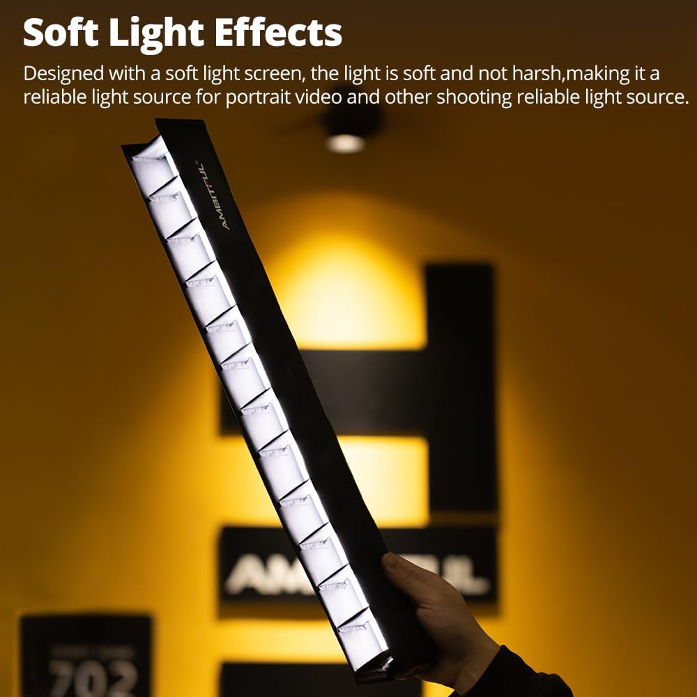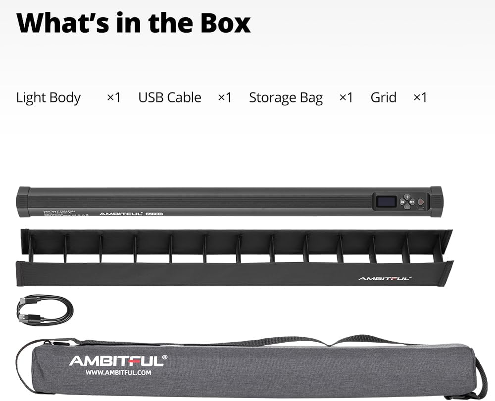 مصباح أنبوبي RGB مُطوّر: – AMBITFUL A2 PRO هو الإصدار المُحسّن من A2، ويتميز بأنبوب أطول، وسطوع أعلى، ووظائف أكثر ثراءً. يفتح هذا المصباح الأنبوبي RGB آفاقًا واسعة للتصوير للمحترفين المبدعين.