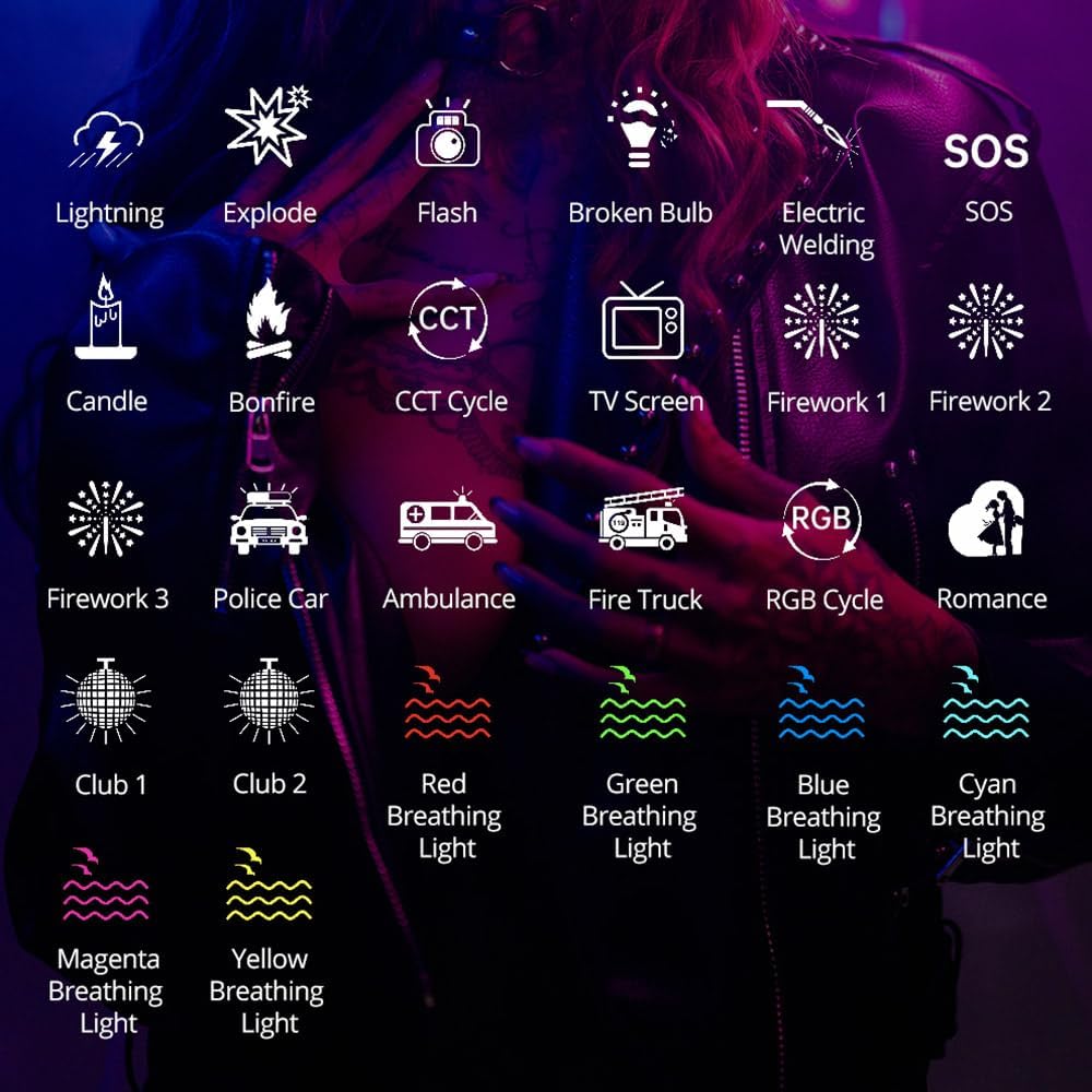 - 20 kinds of light effects, one-key switch: Cop Car/Ambulance/Fire Engine/Lightning/Fireworks/TV/Candle/Party/Fault Bulb/Pulsing/Strobe/RGB Strobe/Paparazzi/Emergency/ H/L Beam /Red Flash/Green Flash/Blue Flash/HSI Slow/HSI Fast